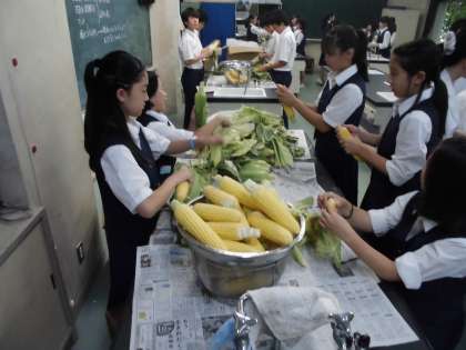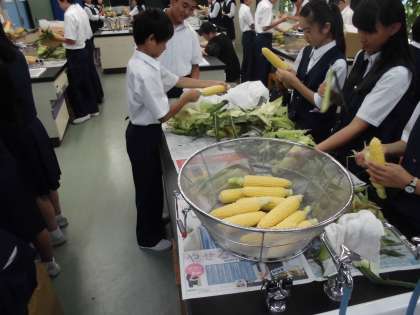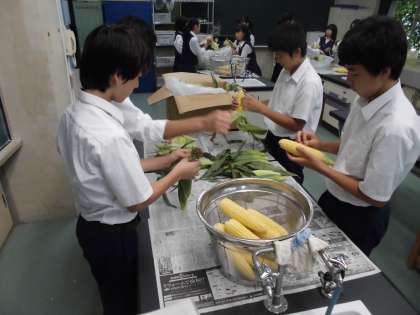 7月18日(火)の早朝、ボランティア部は第2理科室で今日の給食に出される「とうもろこし」の皮をむきました。みんなで協力すると早いですね…。