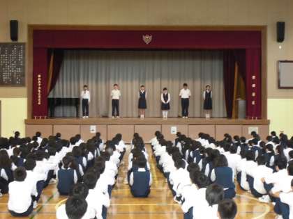 9月25日(月)、生徒会朝礼が行われました。新旧生徒会役員の引継と、前期専門委員長からの挨拶が行われ、後期の役員等にバトンタッチされました。