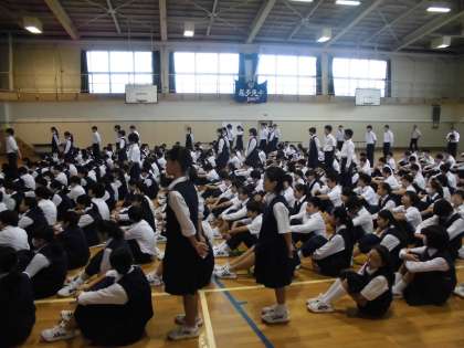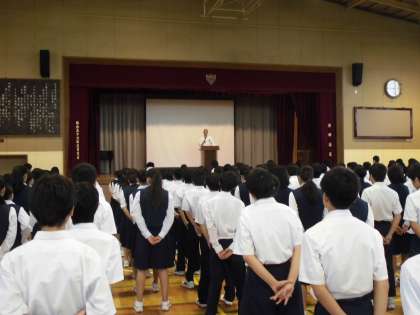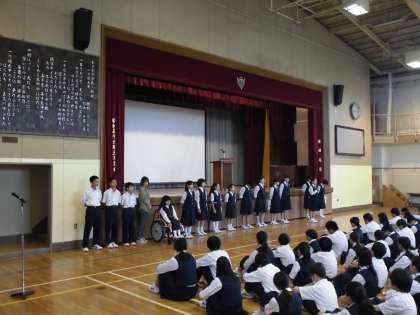 10月2日(月)、いよいよ今年もあと3ヶ月。10月の全校朝礼がありました。校長先生からは、目前に迫った中間考査の取組についての話をしていただきました。また明日の世田谷区陸上大会に参加する生徒の紹介、スクールバディの今後の取組について紹介がありました。