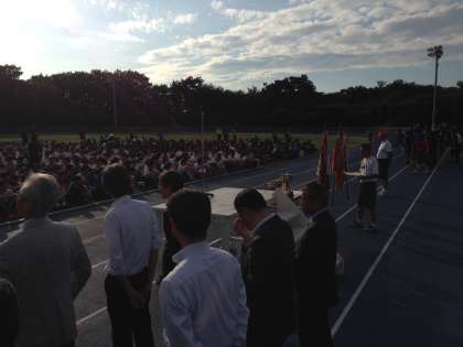 青空のもと、無事に閉会式が終了しました。式後、喜多見中学校だけでミーティングを行い、校長先生から健闘を称え、ねぎらいの言葉をいただきました。選手の皆さん、お疲れさまでした。