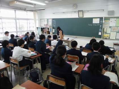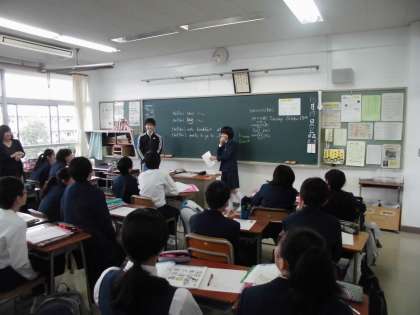 10月16日(火)、1年生英語の授業です。少人数で行っています。今日は友だちの紹介文を書き、発表する取組を行いました。英語科の教員も参加して盛り上がりました。、生徒は3人称・単数・現在形の文を理解しました。