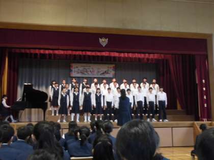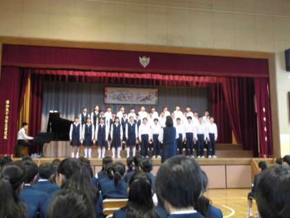 2年生の合唱です。1年生のころに比べ、男声・女声ともきれいな歌声になりました。さすが、後輩のお手本です。
