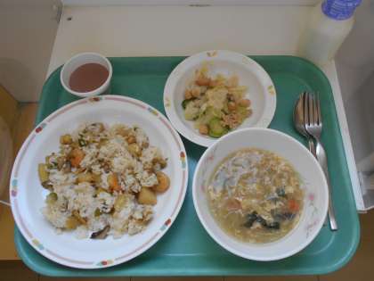 今日は「せたがや食育メニュー」より、雑穀入りシーフードピラフとチンゲンサイと卵のスープを取り入れました。素材の味を活かした適塩メニューです。
