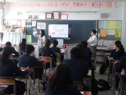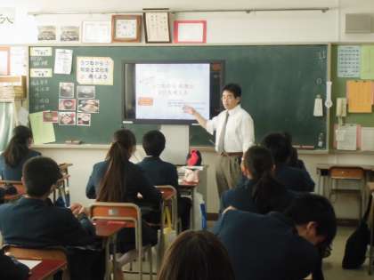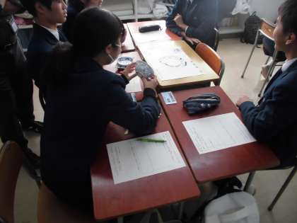 11月9日(木)、和食器のメーカーである三信化工の海老原様をお迎えし、3年生は和食器の学習をしています。和食器の文様に込められた意味を皆で話し合っています。