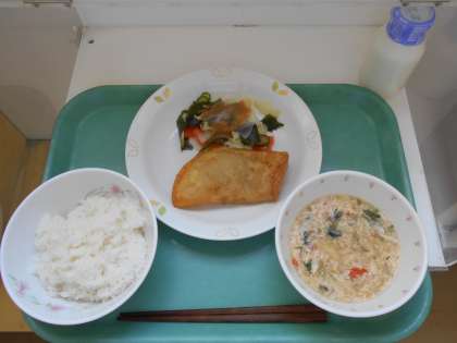 今日は2年B組のリクエスト給食です。1学期の残菜調査で残菜の少なかったクラスに実施しています。ジャンボぎょうざは直径14cmもの大きな餃子の皮で包み、油で揚げて作る人気の料理です。