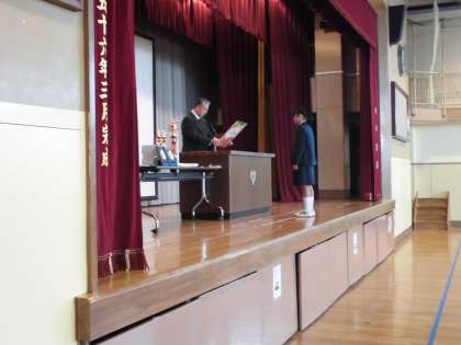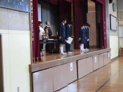 11月13日(月)、全校朝礼が行われました。副校長から「正念場」の意味についての話があり、今週控えている期末考査に向けて、今までの自分の取組を超えて、頑張ってほしいと励ましがありました。続いて、国体に出場し好成績を収めた生徒や世田谷ハーフマラソンで新記録を出した生徒(ともに3年生)、区陸上競技大会の入賞者、競書会での優秀者、バドミントン部の新人大会での個人・団体の表彰が行われました。
