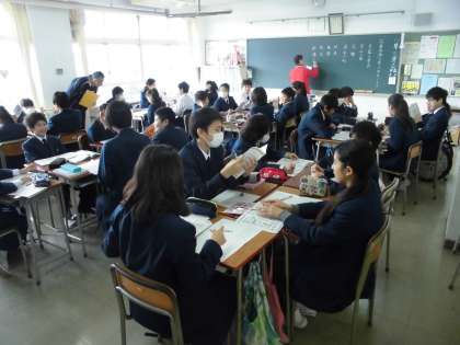 11月15日(水)、1年生の国語の授業です。故事成語を学んで、班で話し合って、例文を考える作業をしています。