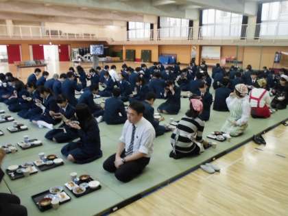11月21日(火)、3年生は和食器で和食を食べ、教科「日本語」の単元で学習した和食の文化や良さを体験しました。保護者の方々や業者の方にお手伝いをいただき、美味しく給食をいただきました。