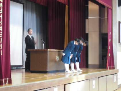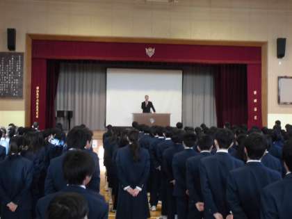 12月11日(月)、全校朝礼が行われました。校長先生からボランティア活動のことや将来の見通しをもった学習の大事さについてお話がありました。表彰では、美術部と古着古布回収ボランティアで3年間をとおして行った生徒に賞状が渡されました。