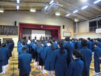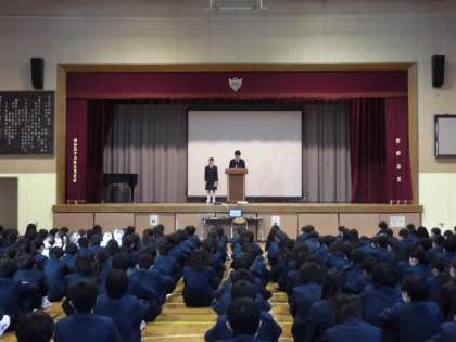 12月18日(月)、生徒会朝礼が行われました。生徒会サミットで話し合った「思いやりの木」を実現するため、生徒会役員から話がありました。各クラスでカードを記入し、昇降口にあるパネルに掲示します。