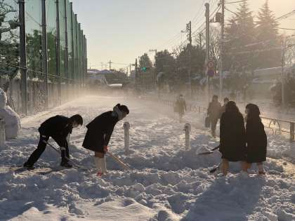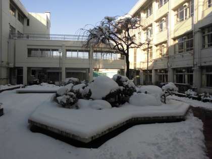1月23日(火)、昨日から降り続いた雪が、グランドを覆いました。何人かの生徒が自発的に雪かきをしてくれました。今日は3年生の都立推薦入試出願です。行き帰りに気を付けてくださいね。