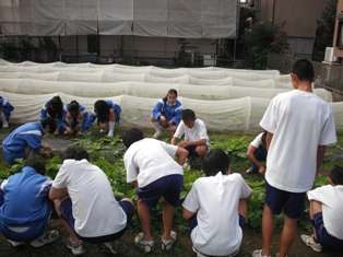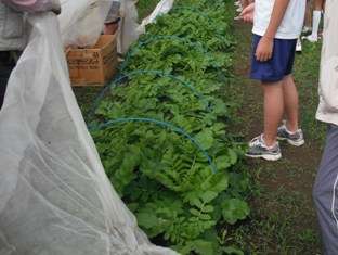 1学年農業体験、いよいよ今回は寒冷紗撤去。