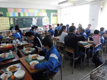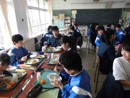 授業後は1年生と給食を一緒にしました。楽しそうに歓談しながら、競技についての質問などをしていました。