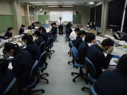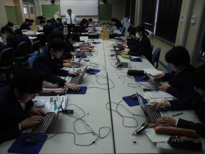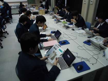 2月23日(金)、1年生の技術の授業です。パソコン室でタブレットを使いながら、ポスターを作成していました。これからの時代に必要なスキルです。