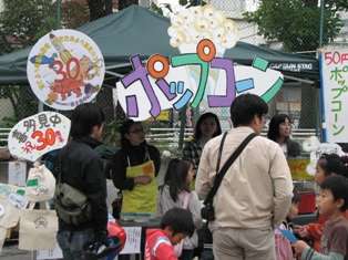 喜多見公園グランドにたくさんの子どもたちが集まりました。本校のPTAや生徒はポップコーンや周年行事グッズ販売、ゲームコーナーの運営で参加しました。作りたてのポップコーンがおいしかった。