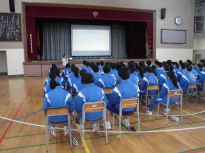 3月9日(金)、3年生は6時間目に「がんについての講話」を行いました。講師は、関東中央病院看護師の井本様。日本におけるがんの現状やがんの予防を学習しました。3年生は、自分の身を守るための様々な取組を行っています。
