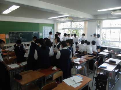 5月14日(月)、新しい1週間が始まりました。1年生はネットリテラシー講座を土曜日に受講しましたので、そのまとめ学年で行っています。2年生は道徳でテーマは「小さいこと」。気が付いたら行動してみようという目的です。3年生は来週に迫った修学旅行の決め事をクラスで行っています。