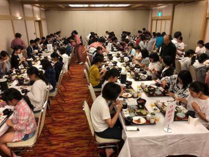 宿舎に到着して、お楽しみの夕食です。たくさん歩いたので、おかわりに多くの生徒が来ていました。