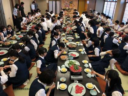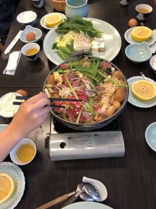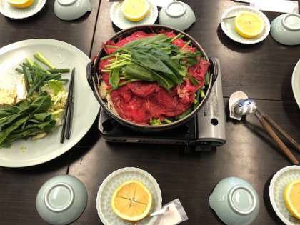 2日目の夕食は、すき焼きです。ちょっと時間的に早い夕食ですが、この後に高台寺で能鑑賞があります。京都の情緒を味わってください。