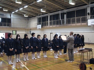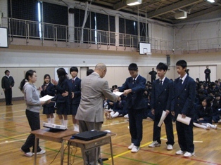 朝礼で、区連合陸上大会の入賞者、区演劇発表会、都美術展覧会の表彰を行いました。喜多見中生、がんばっています。