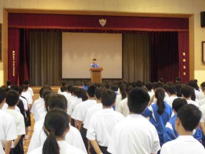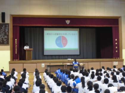 5月28日(月)、生徒会朝礼が行われました。はじめに教育実習生の紹介がありました。次に生徒会や委員会からの取組報告があり、様々呼びかけを行いました。