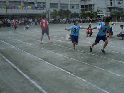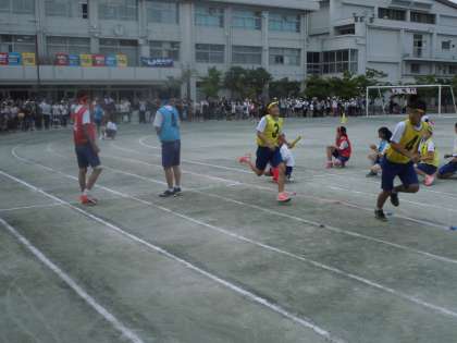 学級対抗リレーは、各クラスとも力が入ります。大声援の中、どのクラス代表も最後まで頑張ってます。