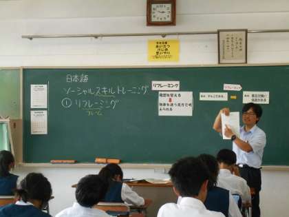 6月7日(木)、1年生の教科「日本語」で、ソーシャルスキルトレーニングを行いました。対人関係を円滑に運ぶための知識と技術を学び、リフレーミングの視点で物事を違う見方で考える取組を学習しました。