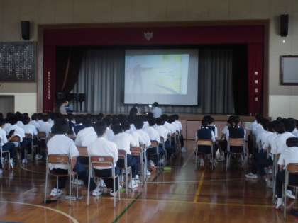 7月4日(水)、3年生は学年集会を行い、来週に予定されている歌舞伎鑑賞教室の事前学習を体育館で行っています。学年の先生方が工夫を凝らし、スライドで説明していました。