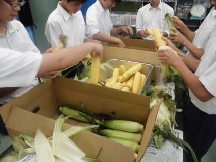 7月9日(月)、朝7時半からボランティア部の活動が行われました。給食で出るとうもろこしの皮むきです。1年生と3年生がお手伝いをしてくれました。手慣れてきたのか要領よく皮むきをしています。