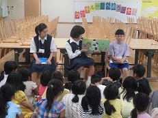 7月27日(金)昨日に引き続き、図書委員を中心にした有志の生徒が、小学校での読み聞かせを行いました。小学生は熱心に聞いてくれていました。
