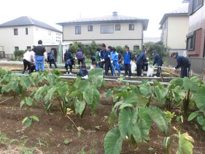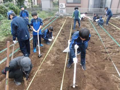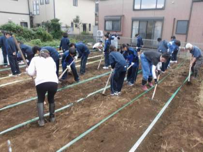 9月7日(金)の放課後、1年生は大蔵大根栽培の畝づくりを行いました。昨日、雑草をとり耕した畑に鍬を入れて、畝をつくりました。明日は種まきです。
