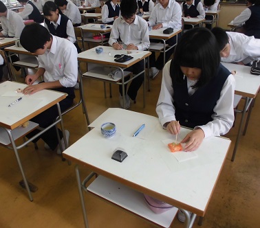 10月12日(金)、3年美術の授業です。生の和菓子とお茶をいただきながら、いろんな角度から見たり、眺めたり、味わったりしながら、和菓子を創作していく授業です。次回以降が楽しみです。完成品は学習成果展覧会のお楽しみです。