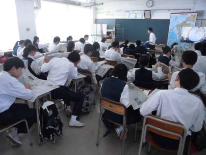 10月17日(水)、2年生の社会の授業では、新聞を活用しています。好きな記事を選んで、内容を要約して皆に伝える作業をしています。本校はNIE実践指定校でもありますので、様々に工夫を凝らしながら、新聞に親しむ授業づくりを行っています。