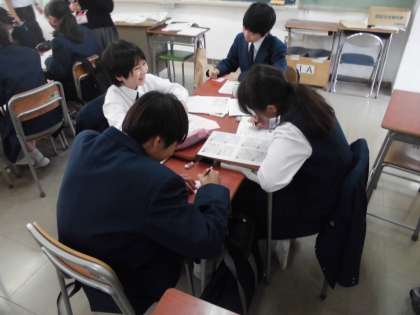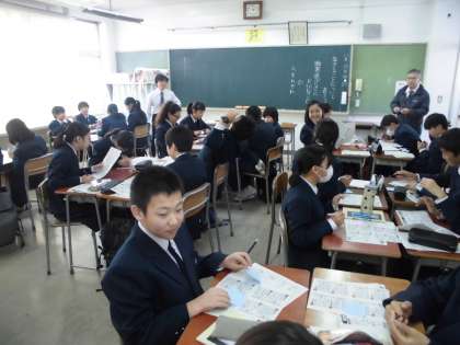 11月29日(木)、校内研修で1年生の教科「日本語」哲学領域の研究授業を行いました。「生きることを考える」を題材に、自分の特性をメタ認知して、将来の自分の職業を考えてみる取組でした。お互いの良いところを付箋に書きながら、自分を見つめていました。