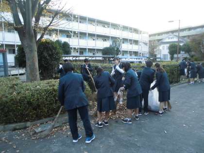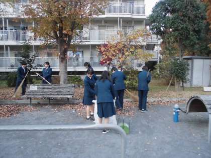 12月10日(月)、生徒会主催の「落ち葉掃きボランティア」が始まりました。近隣の喜多見団地内の公園を清掃します。今日から水曜を除く4日間、61名の生徒ボランティアが活動します。