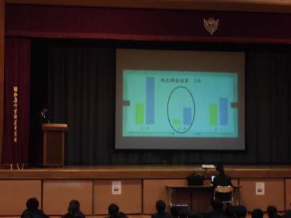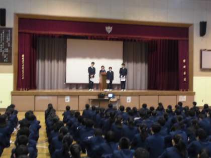 12月17日(月)、新しい週の始まりは「生徒会朝礼」です。保健給食委員からは残菜調査の結果が報告されました。また、図書委員からは読書週間の個人で読書した本の冊数が報告され、表彰されました。さらに生徒会本部からは落ち葉掃きボランティアの参加者へ感謝状が手渡され、盛りだくさんの生徒会朝礼でした。