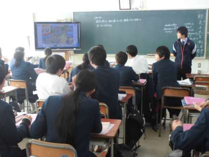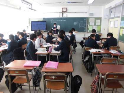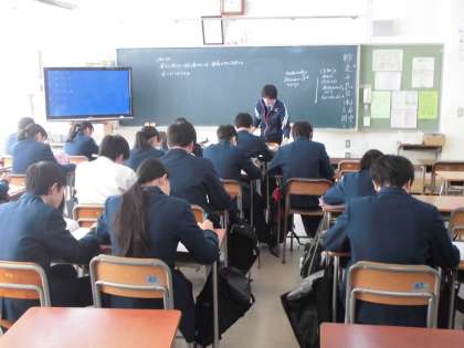12月19日(水)、3年生の英語の授業です。習熟度別少人数クラスで指導しています。本文の背景にある心情等を理解する取組です。高校に向けて、レベルアップした内容に取り組んでいます。