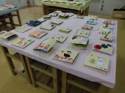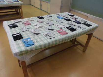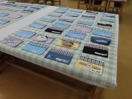 家庭科作品:ブックカバー(1年)、ファスナーポーチ(2年)、布絵本(3年)を被服室で展示中。