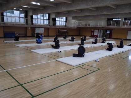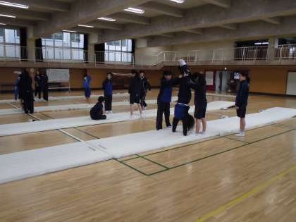 2月13日(水)、1年生女子の体育の授業です。マット運動を助け合いながら、アドバイスし合いながら、演技の構成を考えていました。