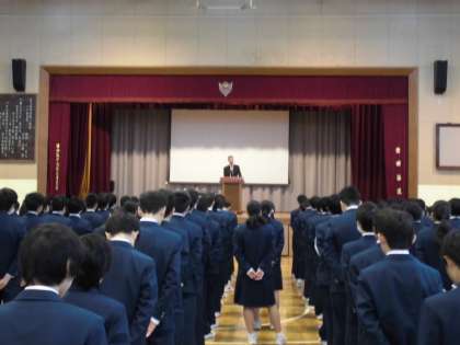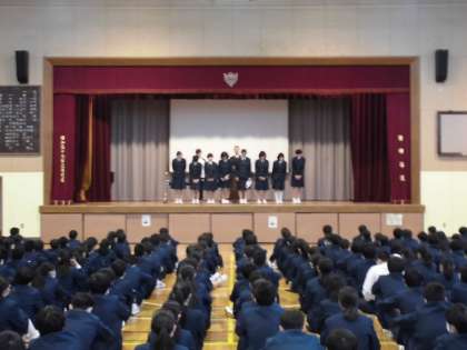 3月4日(月)、久しぶりに体育館で全校朝礼が行われました。校長先生のお話の後、数多くの表彰が行われました。学校だより3月号で表彰者は氏名を掲載します。