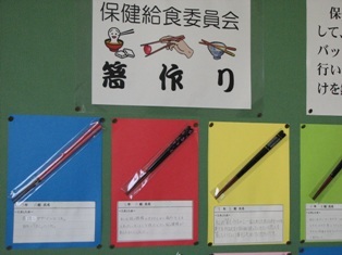 保健給食委員会では、食育の取り組みとして、「箸」の歴史と持ち方の学習、最後に折れた野球のバットを材料とした箸作りをしました。
