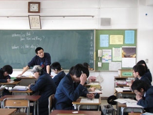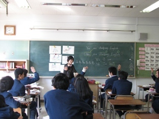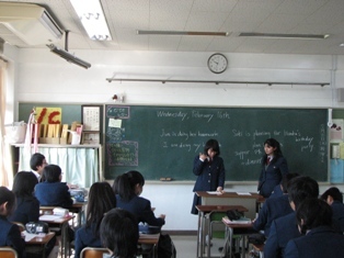 現在進行形の学習です。生活の中の音を聞いて何をしているかを推測し疑問文を作ったり、ペアを作っての学習、ロールプレイを取り入れた学習を行いました。