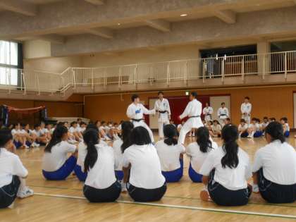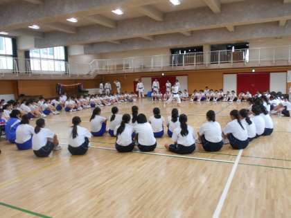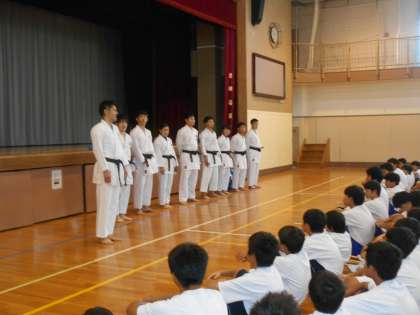 始めに空手道の歴史や、空手には大きく分けて「形」と「組手」があることのお話、演武の模範演技、組手ではどのような技がポイントになるかなどの説明がありました。
