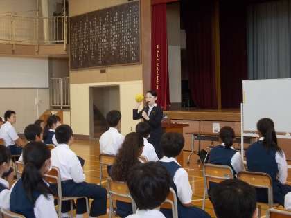 元キャビンアテンダントの方に講師として来ていただき、これから様々な場面で必要になるマナーを教えていただきました。お辞儀の角度、言葉遣いや身だしなみなど、実際にやってみて学んでいきました。「積極的にお辞儀の練習に取り組む前向きな生徒さんがいて、感心しました。」というお手紙をいただきました。自然に使えるように身につけていきましょう。
