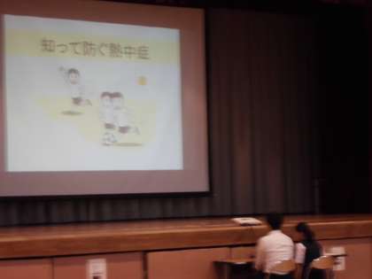 保健給食委員会は、熱中症について発表しました。これからの季節、気をつけなくてはいけないポイントについてパワーポイントを使い、わかりやすく説明してくれました。
