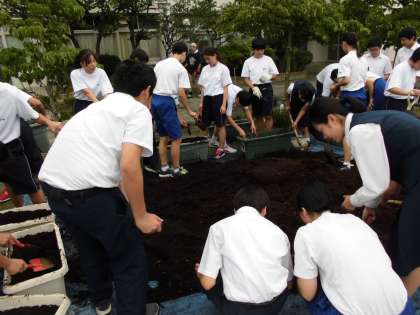 7月5日(金)生徒会の新たな取り組みである、ひまわりプロジェクトに多くのボランティアが参加してくれました。今日は、プランターに土を入れました。「福島ひまわり里親プロジェクト」は、ひまわりの栽培を通して、福島の復興を支援しようという取り組みです。みんなで協力して、大輪の花を咲かせましょう。