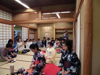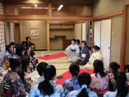7月7日(日)羽根木公園にある茶室で世田谷区内の他の中学校と合同でお茶会があり、本校の煎茶道部も参加しました。お茶の歴史等の講義を受け、それぞれの学校ごとお点前の披露となりました。普段の部活動では標準服でお茶を点てていますが、今回は浴衣姿でした。練習の成果が発揮され、洗練された振る舞いでした。