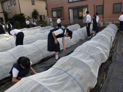 9月9日(月)朝7時の時点で世田谷区の暴風警報が解除されていた為、本校は通常授業でした。しかし、校庭では倒れているものや折れている木もありました。大蔵大根の畑は土曜日に台風対策をしていたため、出ていた芽は守られていました。