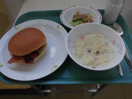 今日の給食は、照り焼きチキンバーガー、牛乳、クラムチャウダー、ツナサラダです。