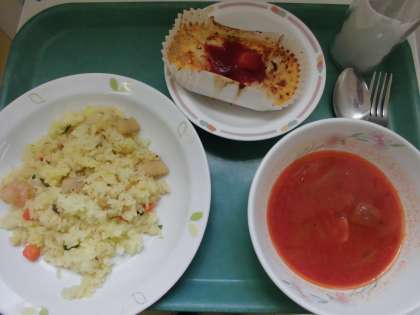 今日の給食は、パエリヤ、牛乳、サルモレホ、トルティージャです。
